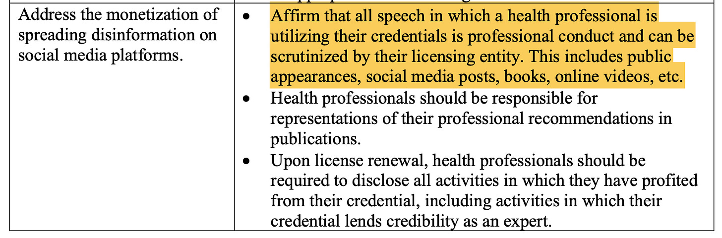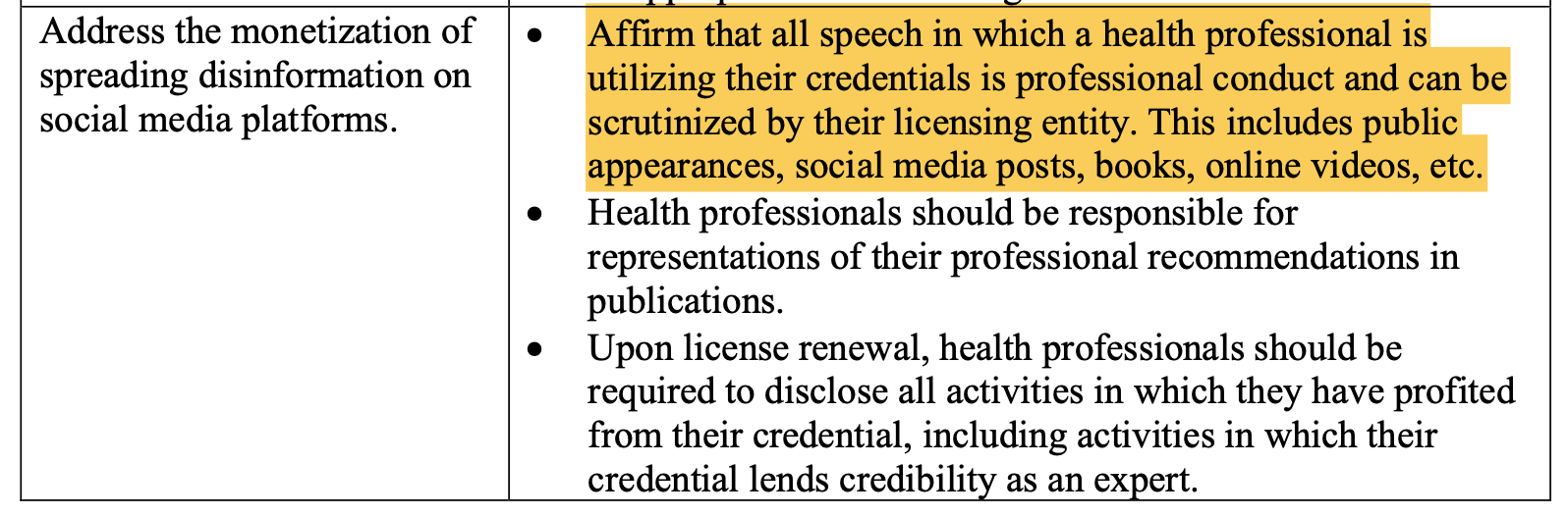 The appendix was explicit: “all speech in which a health professional is utilizing their credentials is professional conduct and can be scrutinized by their licensing entity.”1