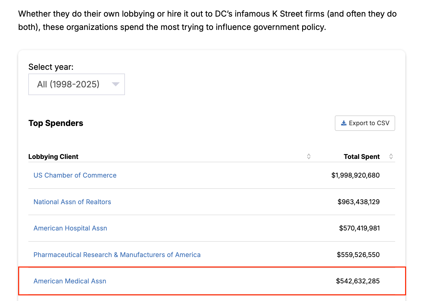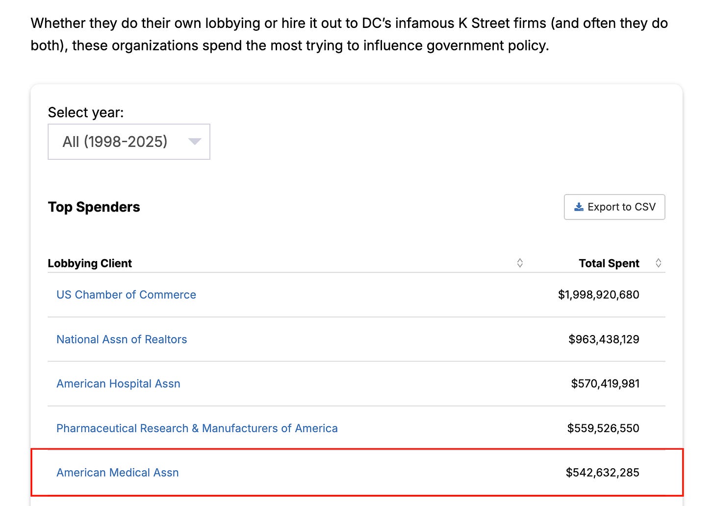 The AMA is not a licensing body. It does not grant or revoke medical licenses. What it is—by dollar figures—is one of the most powerful lobbies in Washington, consistently ranking at the top of federal lobbying disclosures. According to OpenSecrets.org between 1998-2025, the AMA spent over $542 million lobbying congress and influencing government policy.