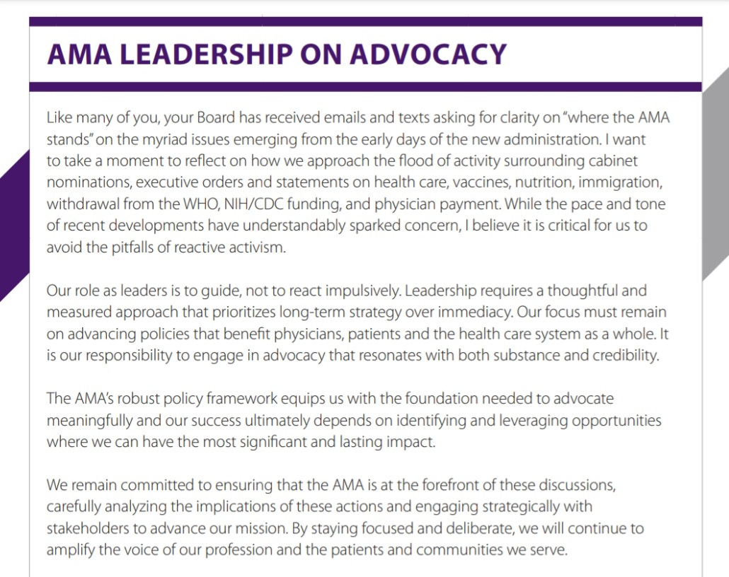 But in January 2025, the AMA Board cautioned members against “reactive activism” as federal policies rolled back science-based protections. Physicians were urged to be “strategic” and avoid partisan “flare-ups” .